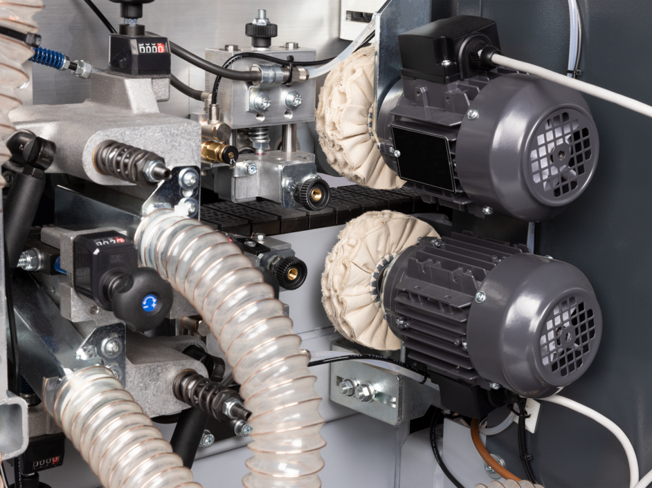 Duas escovas rotativas de algodão fazem o polimento da borda, removendo marcas de corte ou resíduos de fresagem e deixando o acabamento com aspecto final profissional.