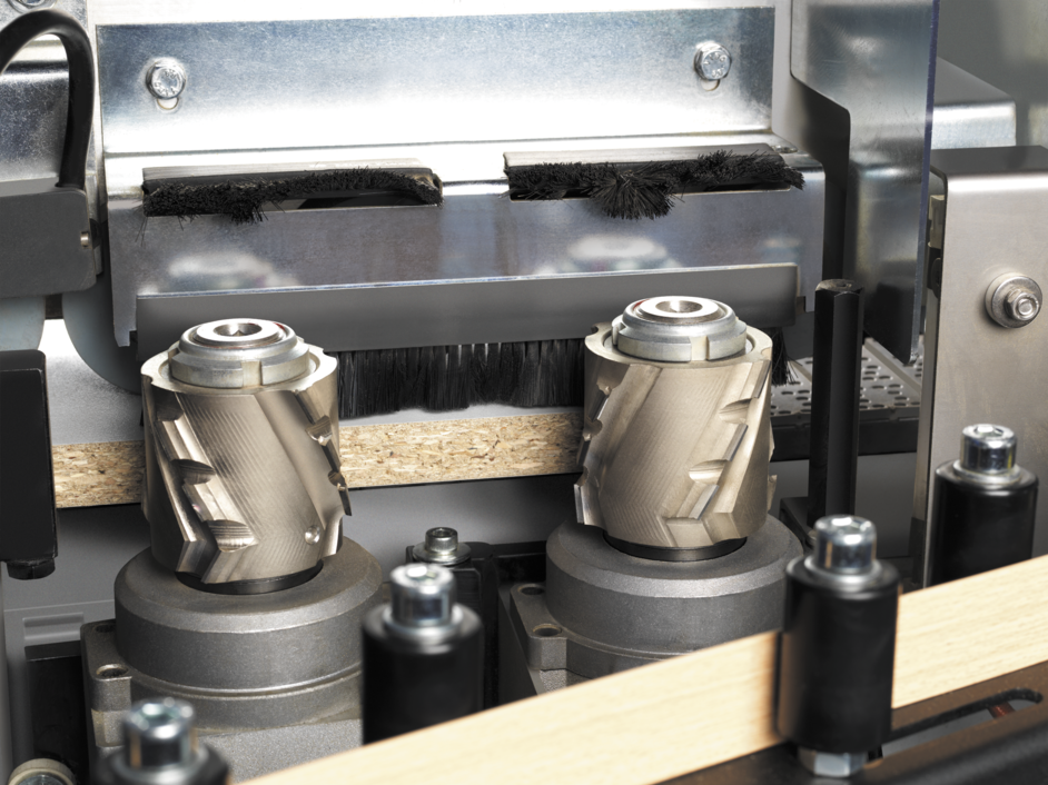 Antes da aplicação da fita, o painel passa por um conjunto de fresas helicoidais com pastilhas de diamante. Esse sistema remove imperfeições nas bordas do painel, como ondulações causadas por cortes irregulares, garantindo uma superfície limpa e uniforme para a aplicação da cola.