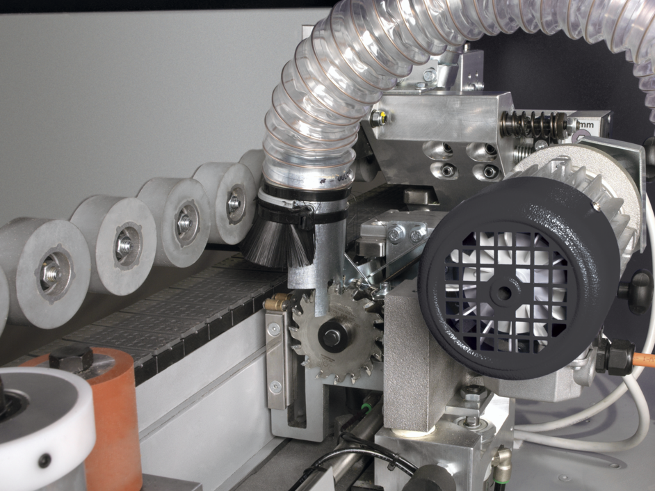 As extremidades da fita são cortadas por serras circulares girando a 9.000 rpm, garantindo um corte limpo e preciso, mesmo em materiais mais duros como ABS ou madeira natural.